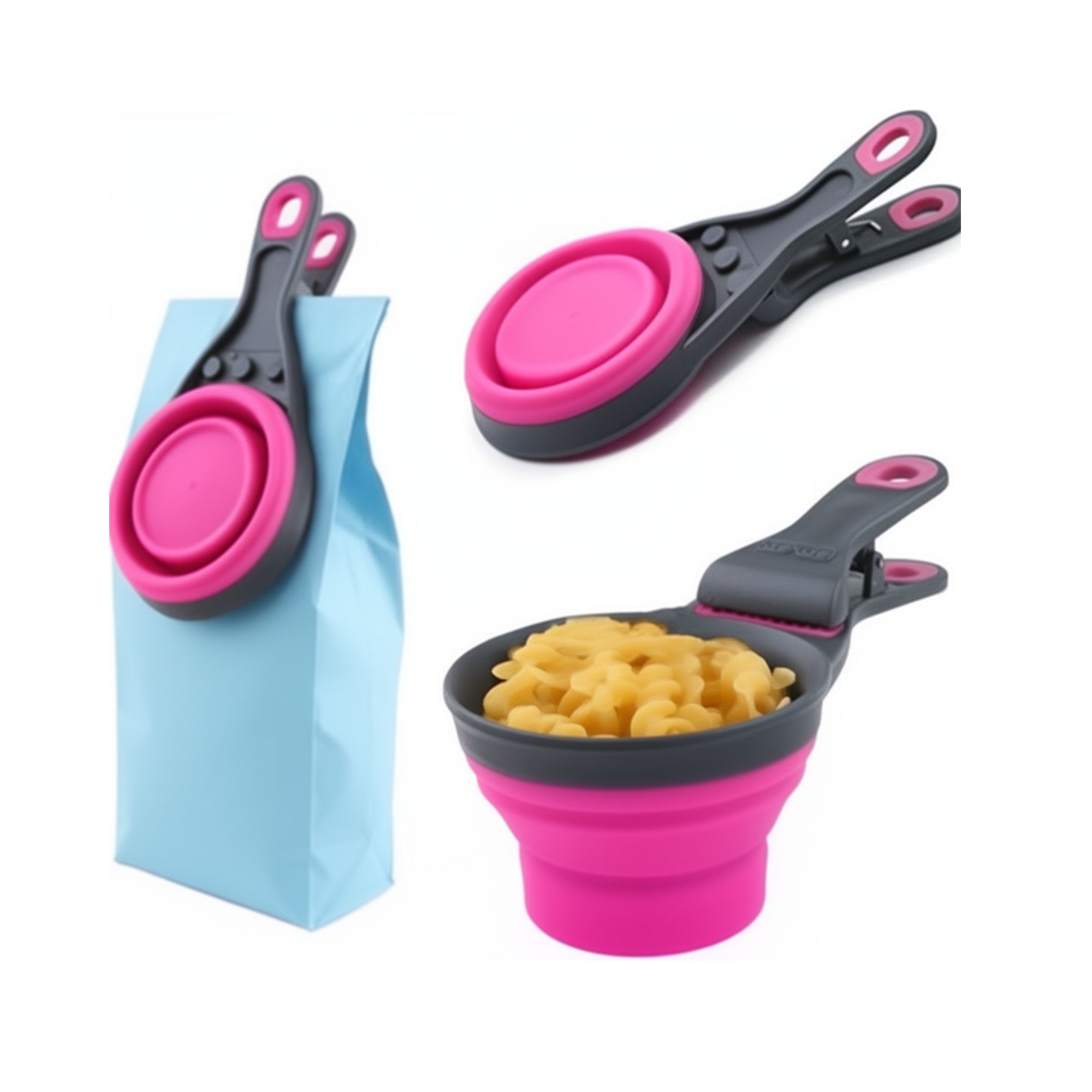 - Works as a food scoop, a collapsible measuring cup, and a bag clip.