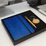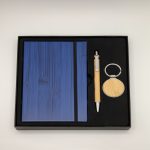 - Gift set includes a journal, wooden pen and keychain.